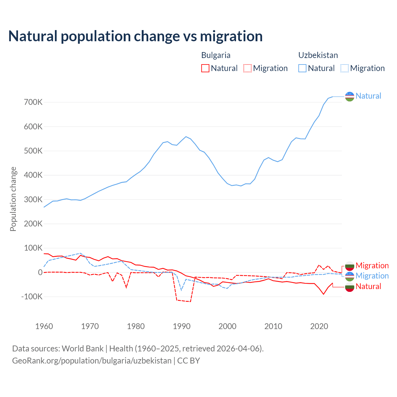 Over the last 10 years, 92.1% of the population change in Bulgaria is from natural causes (a loss of 528,535 people) and 7.94% is from migration (a gain of 45,567 people). In Uzbekistan 98.2% is from natural causes (a gain of 6,161,117 people) and 1.84% is from migration (a loss of 115,398 people).