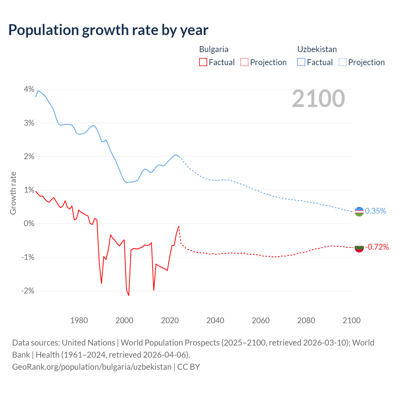 - For the last 10 years, Bulgaria has had an average growth rate of -0.96% per year vs +1.85% in Uzbekistan.
