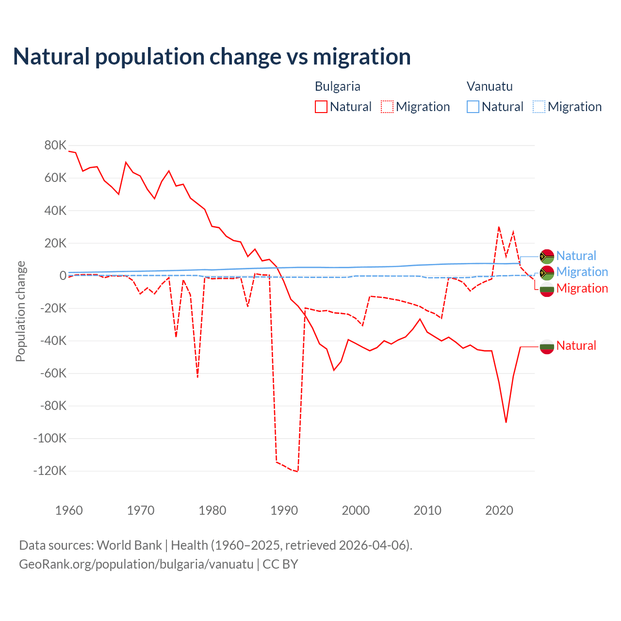 Over the last 10 years, 92.1% of the population change in Bulgaria is from natural causes (a loss of 528,535 people) and 7.94% is from migration (a gain of 45,567 people). In Vanuatu 92.2% is from natural causes (a gain of 72,941 people) and 7.81% is from migration (a loss of 6,181 people).