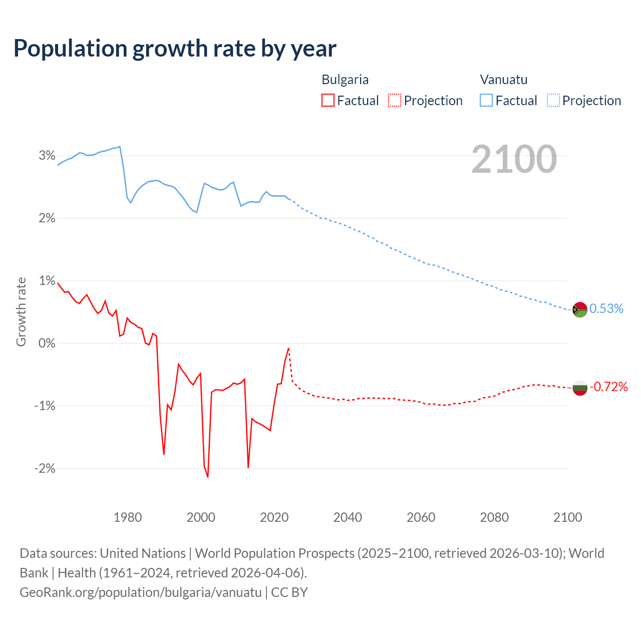 - For the last 10 years, Bulgaria has had an average growth rate of -0.96% per year vs +2.33% in Vanuatu.