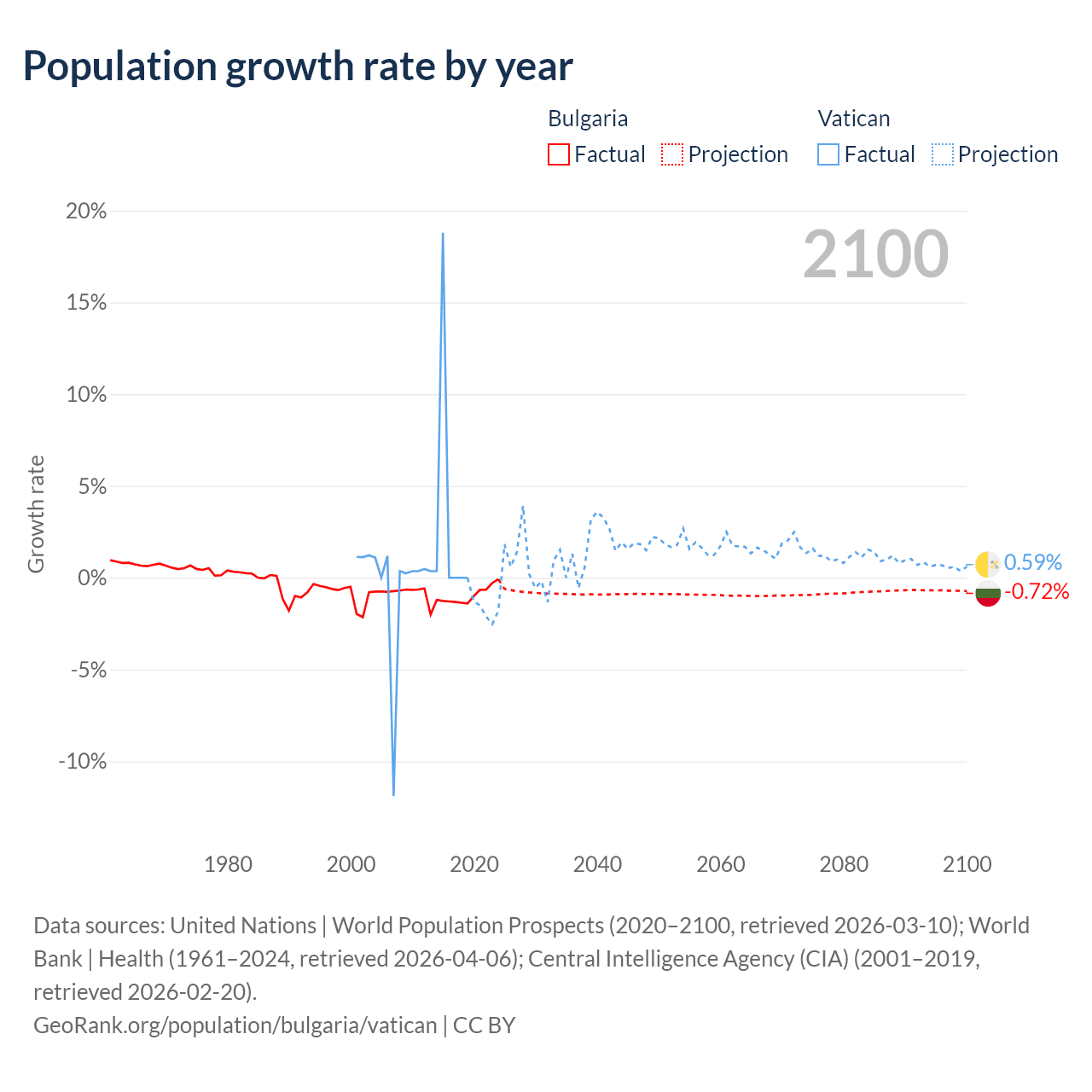 - For the last 10 years, Bulgaria has had an average growth rate of -0.96% per year vs +1.9% in the Vatican.