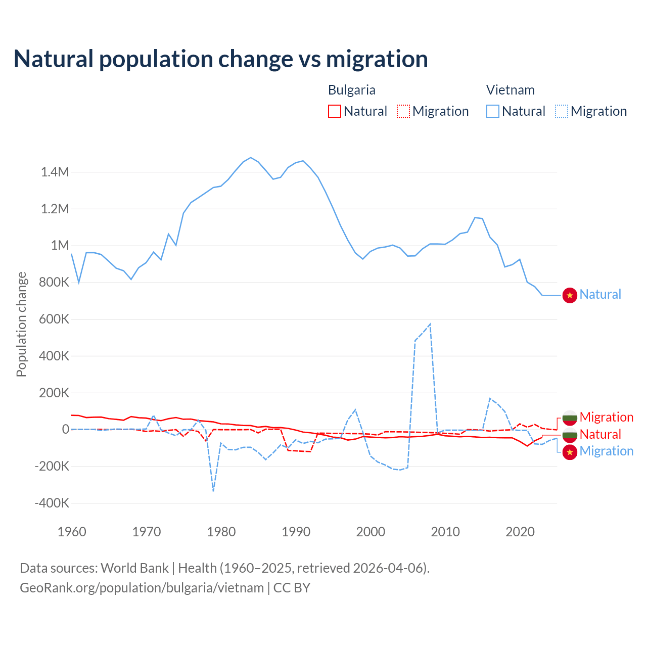 Over the last 10 years, 92.1% of the population change in Bulgaria is from natural causes (a loss of 528,535 people) and 7.94% is from migration (a gain of 45,567 people). In Vietnam 97.7% is from natural causes (a gain of 9,349,756 people) and 2.29% is from migration (a gain of 219,073 people).
