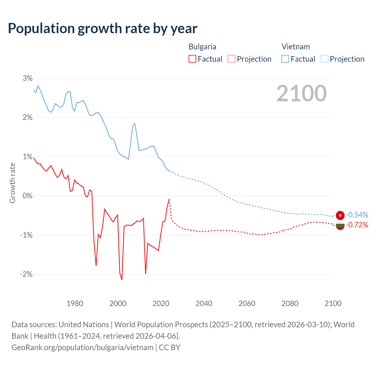 - For the last 10 years, Bulgaria has had an average growth rate of -0.96% per year vs +0.99% in Vietnam.