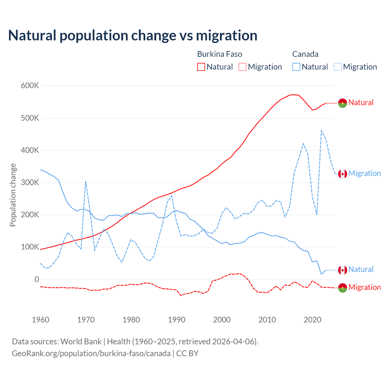 Over the last 10 years, 96.9% of the population change in Burkina Faso is from natural causes (a gain of 5,506,960 people) and 3.13% is from migration (a loss of 177,923 people). In Canada 19.4% is from natural causes (a gain of 789,345 people) and 80.6% is from migration (a gain of 3,276,554 people).