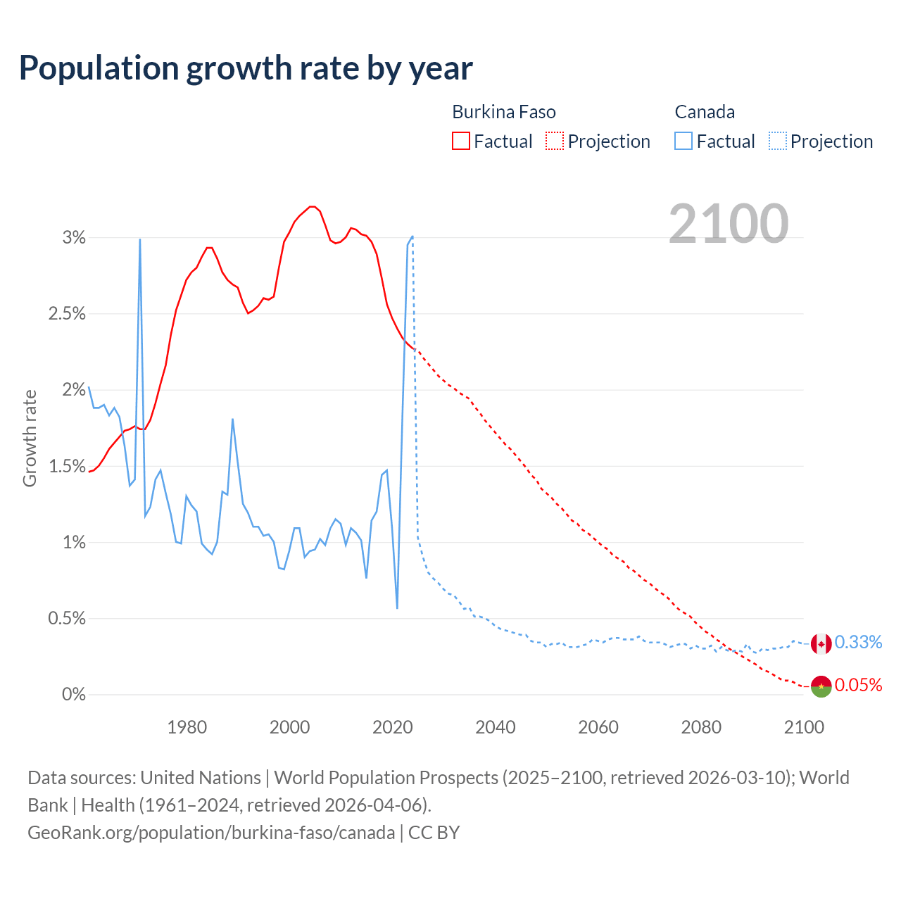 - For the last 10 years, Burkina Faso has had an average growth rate of +2.63% per year vs +1.5% in Canada.