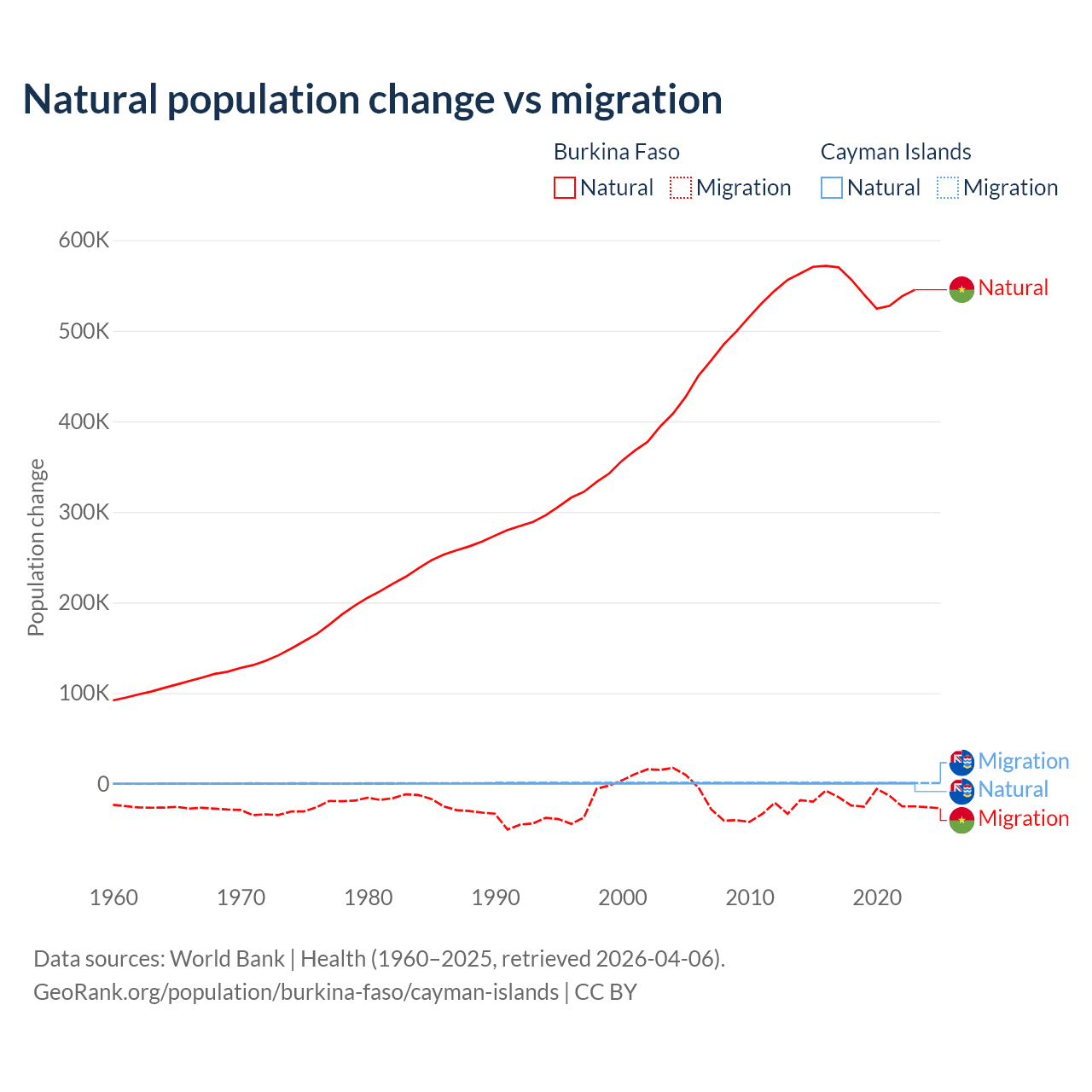 Over the last 10 years, 96.9% of the population change in Burkina Faso is from natural causes (a gain of 5,506,960 people) and 3.13% is from migration (a loss of 177,923 people). In the Cayman Islands 31.1% is from natural causes (a gain of 4,468 people) and 68.9% is from migration (a gain of 9,879 people).