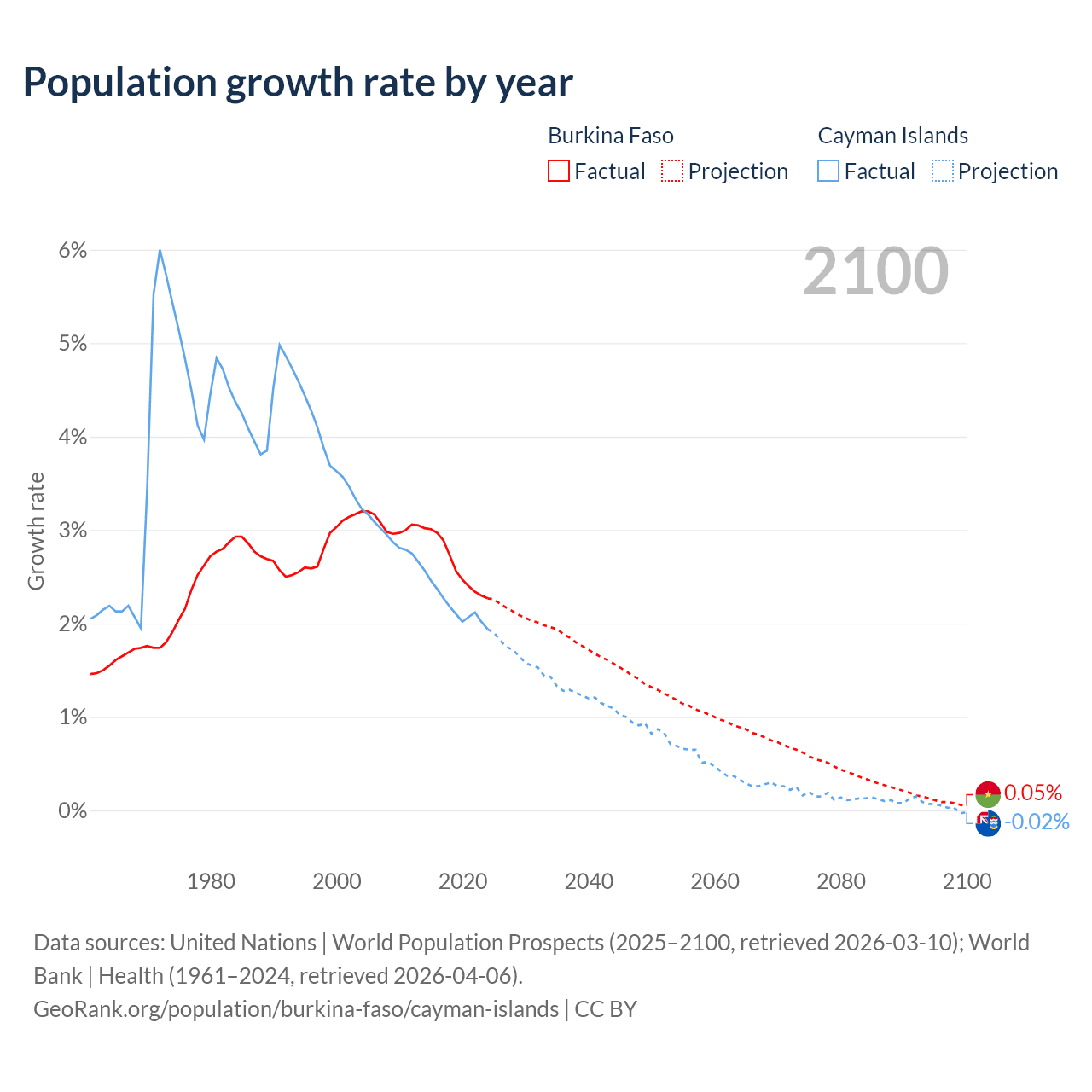 - For the last 10 years, Burkina Faso has had an average growth rate of +2.63% per year vs +2.19% in the Cayman Islands.