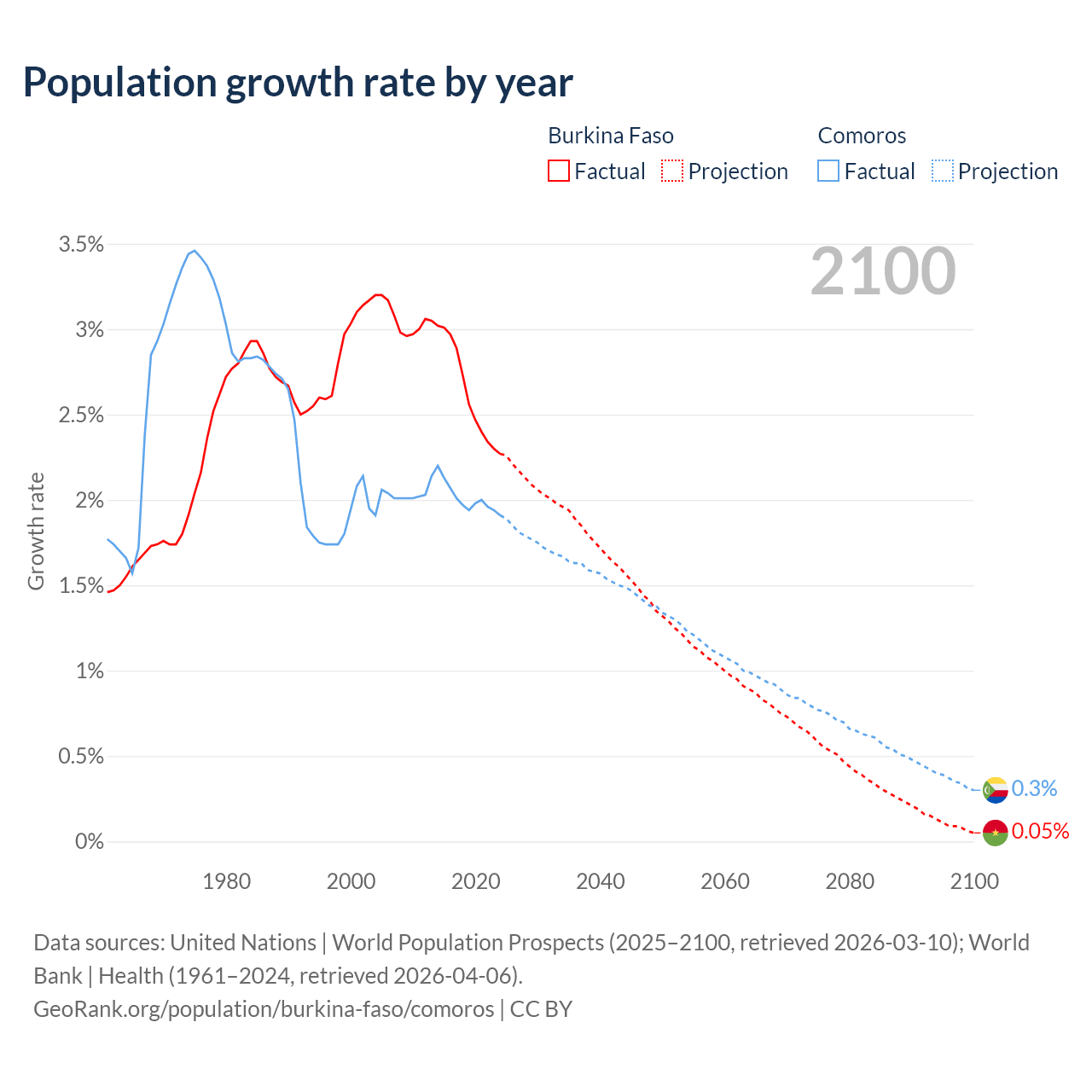 - For the last 10 years, Burkina Faso has had an average growth rate of +2.63% per year vs +2.01% in Comoros.