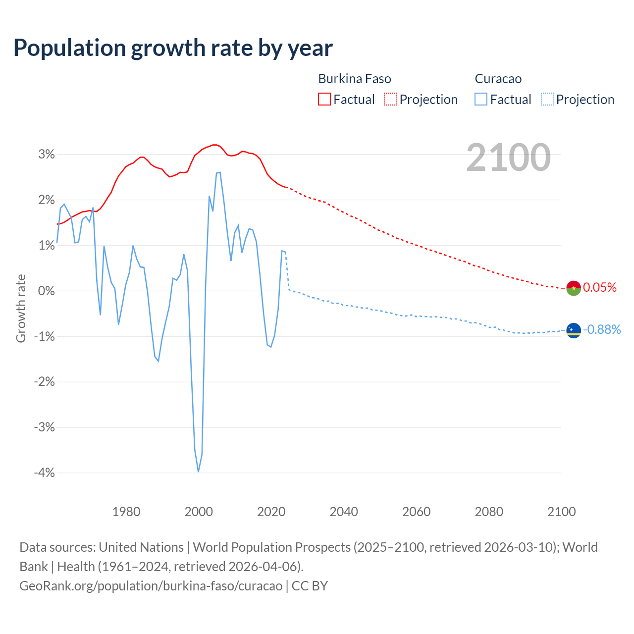 - For the last 10 years, Burkina Faso has had an average growth rate of +2.63% per year vs +0.13% in Curacao.