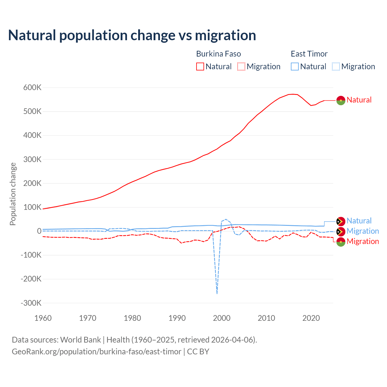 Over the last 10 years, 96.9% of the population change in Burkina Faso is from natural causes (a gain of 5,506,960 people) and 3.13% is from migration (a loss of 177,923 people). In East Timor 98.3% is from natural causes (a gain of 217,698 people) and 1.66% is from migration (a gain of 3,665 people).
