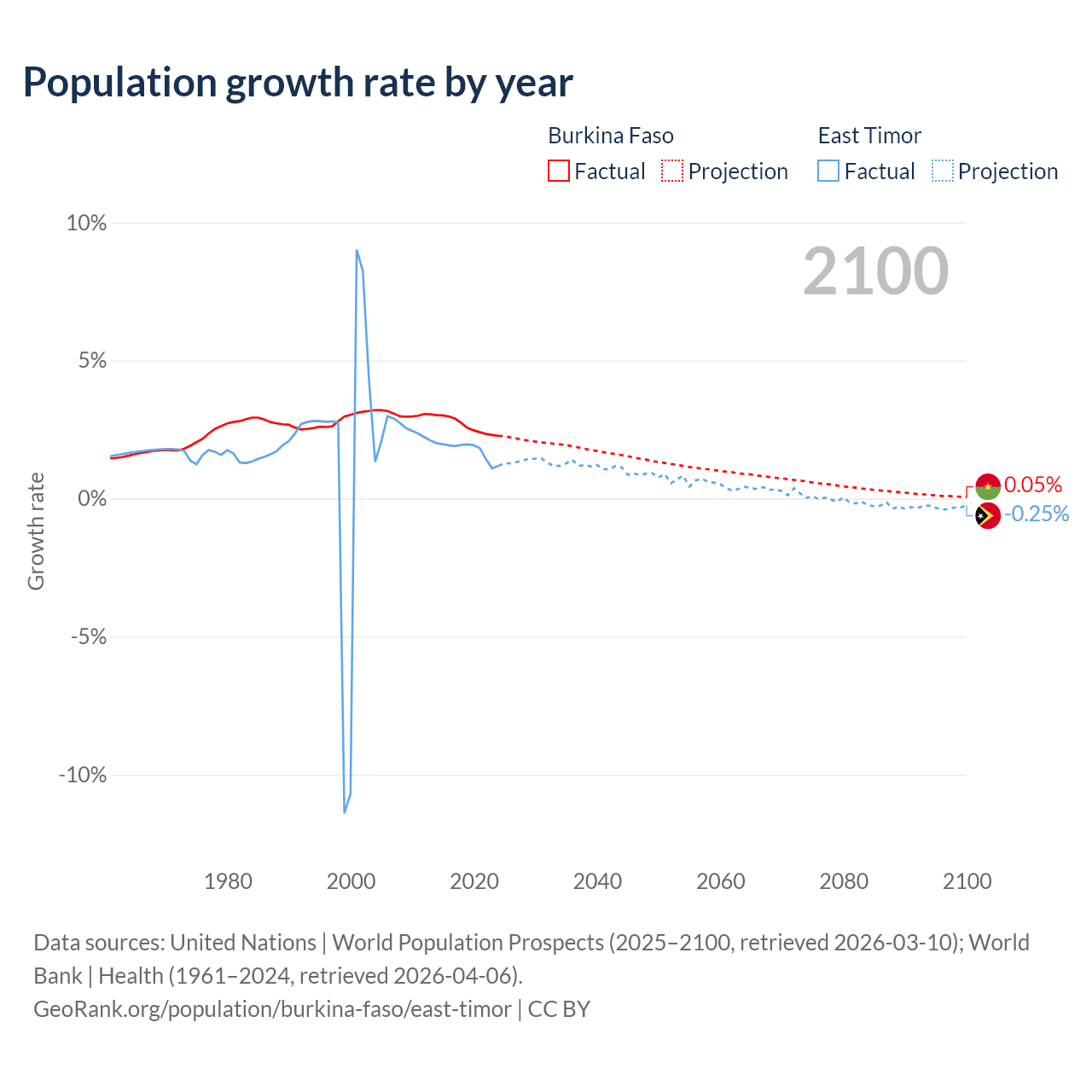 - For the last 10 years, Burkina Faso has had an average growth rate of +2.63% per year vs +1.74% in East Timor.