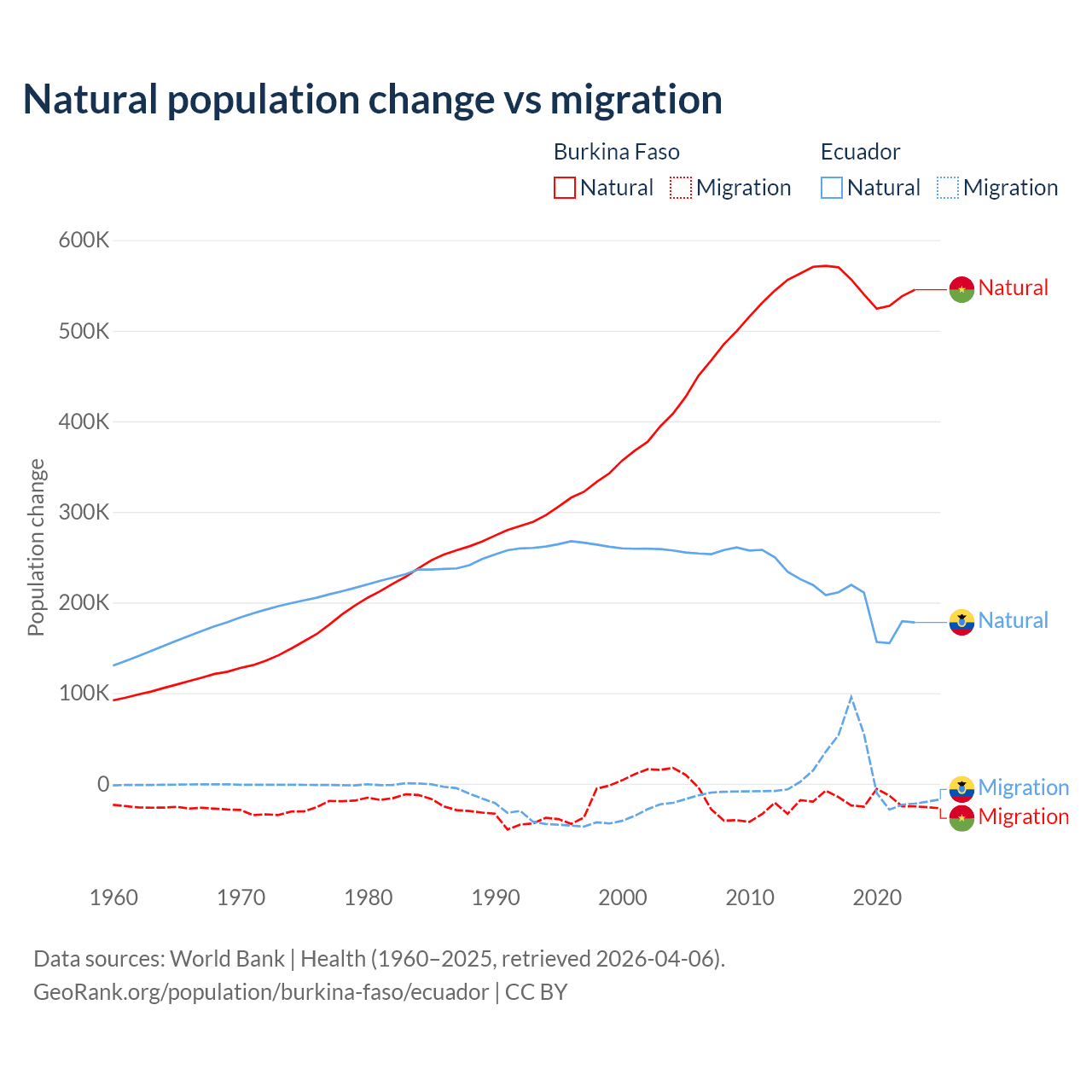 Over the last 10 years, 96.9% of the population change in Burkina Faso is from natural causes (a gain of 5,506,960 people) and 3.13% is from migration (a loss of 177,923 people). In Ecuador 91.9% is from natural causes (a gain of 1,964,352 people) and 8.08% is from migration (a gain of 172,707 people).