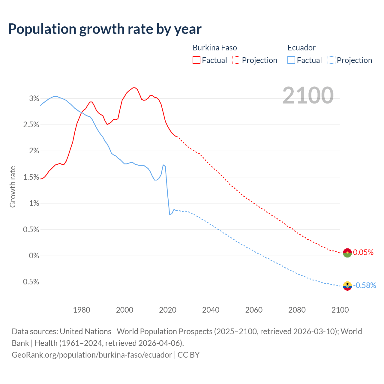 - For the last 10 years, Burkina Faso has had an average growth rate of +2.63% per year vs +1.26% in Ecuador.