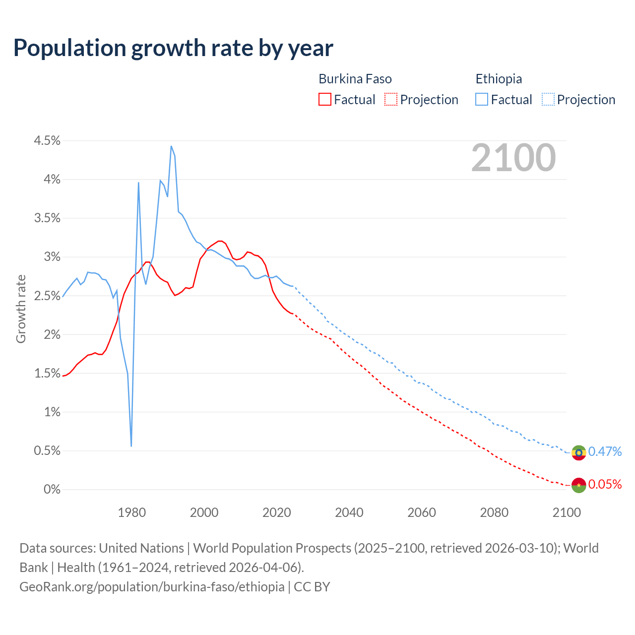 - For the last 10 years, Burkina Faso has had an average growth rate of +2.63% per year vs +2.71% in Ethiopia.