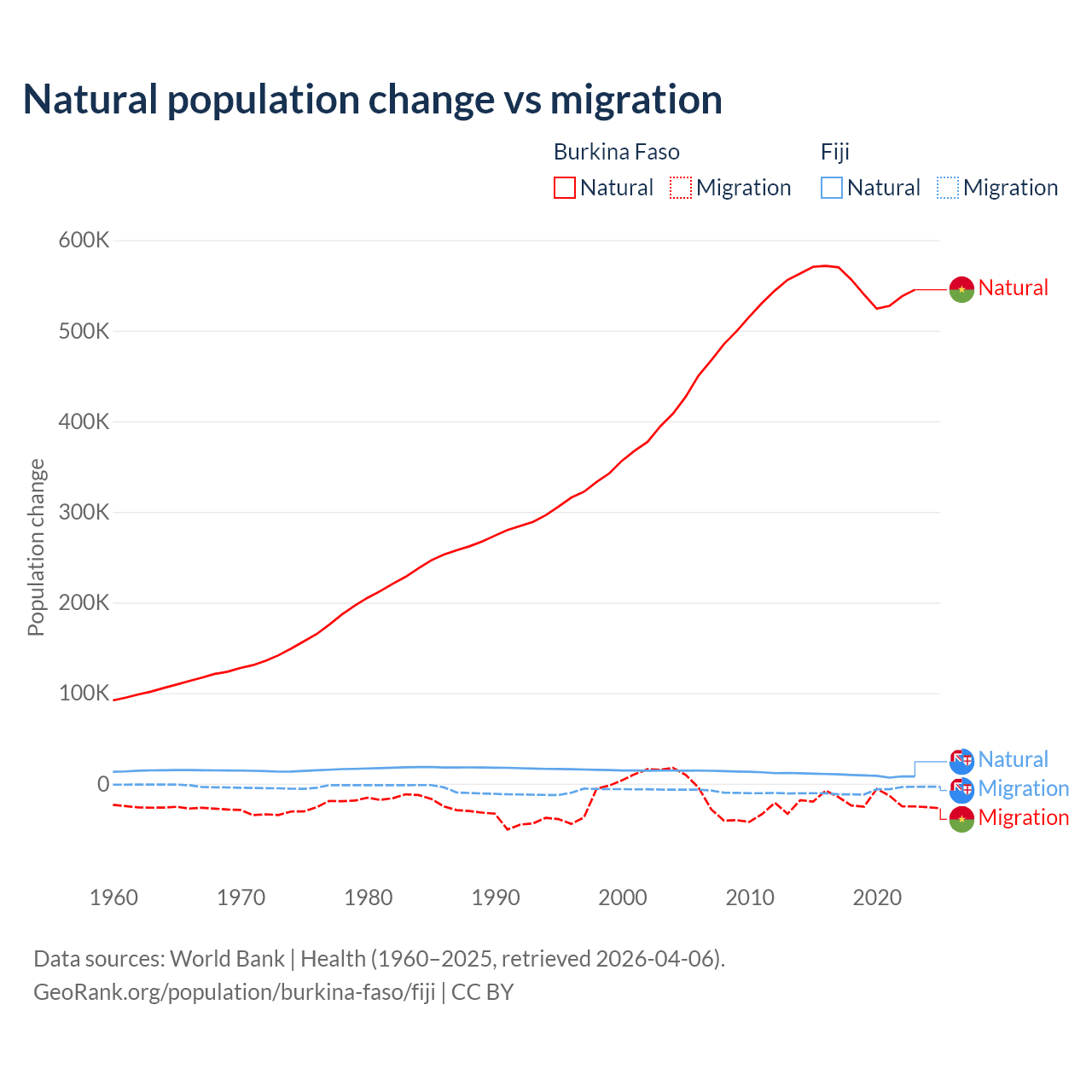 Over the last 10 years, 96.9% of the population change in Burkina Faso is from natural causes (a gain of 5,506,960 people) and 3.13% is from migration (a loss of 177,923 people). In Fiji 52.6% is from natural causes (a gain of 94,971 people) and 47.4% is from migration (a loss of 85,415 people).
