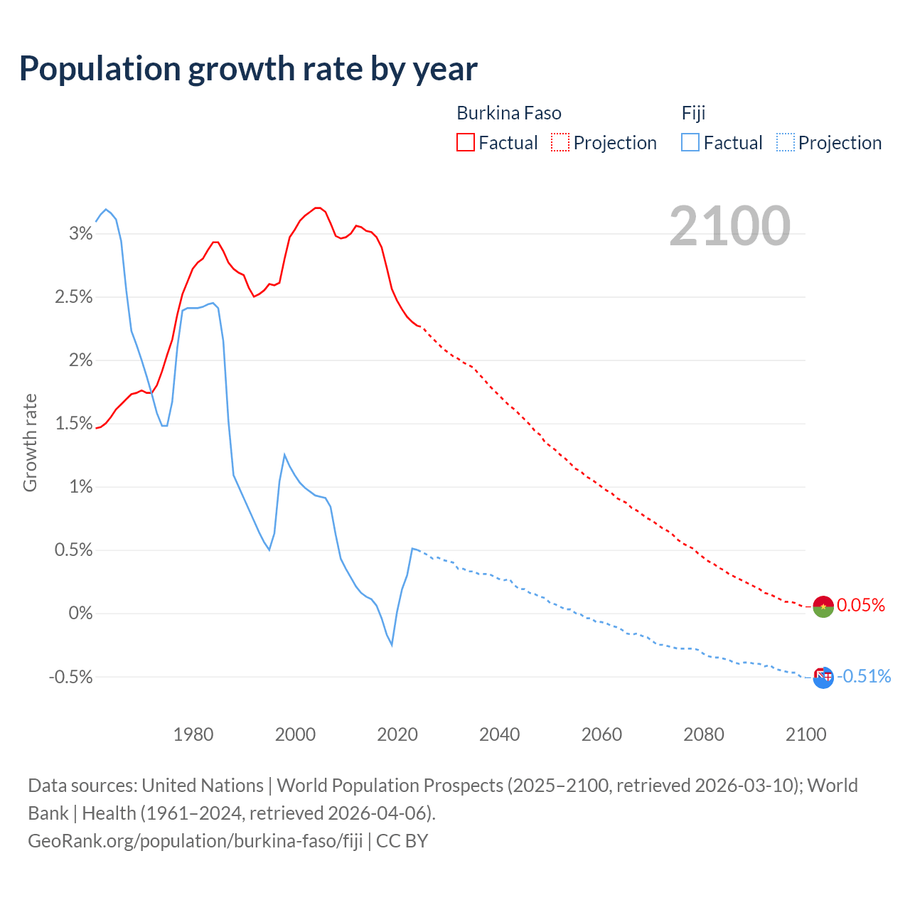 - For the last 10 years, Burkina Faso has had an average growth rate of +2.63% per year vs +0.12% in Fiji.