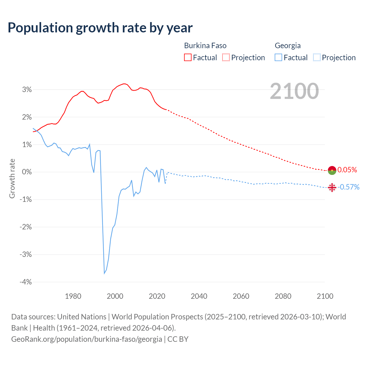 - For the last 10 years, Burkina Faso has had an average growth rate of +2.63% per year vs -0.04% in Georgia.