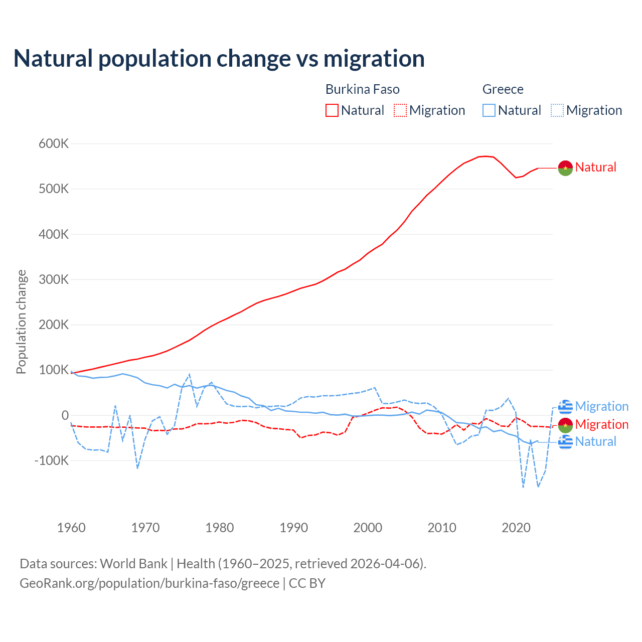 Over the last 10 years, 96.9% of the population change in Burkina Faso is from natural causes (a gain of 5,506,960 people) and 3.13% is from migration (a loss of 177,923 people). In Greece 51.9% is from natural causes (a loss of 411,426 people) and 48.1% is from migration (a loss of 381,824 people).