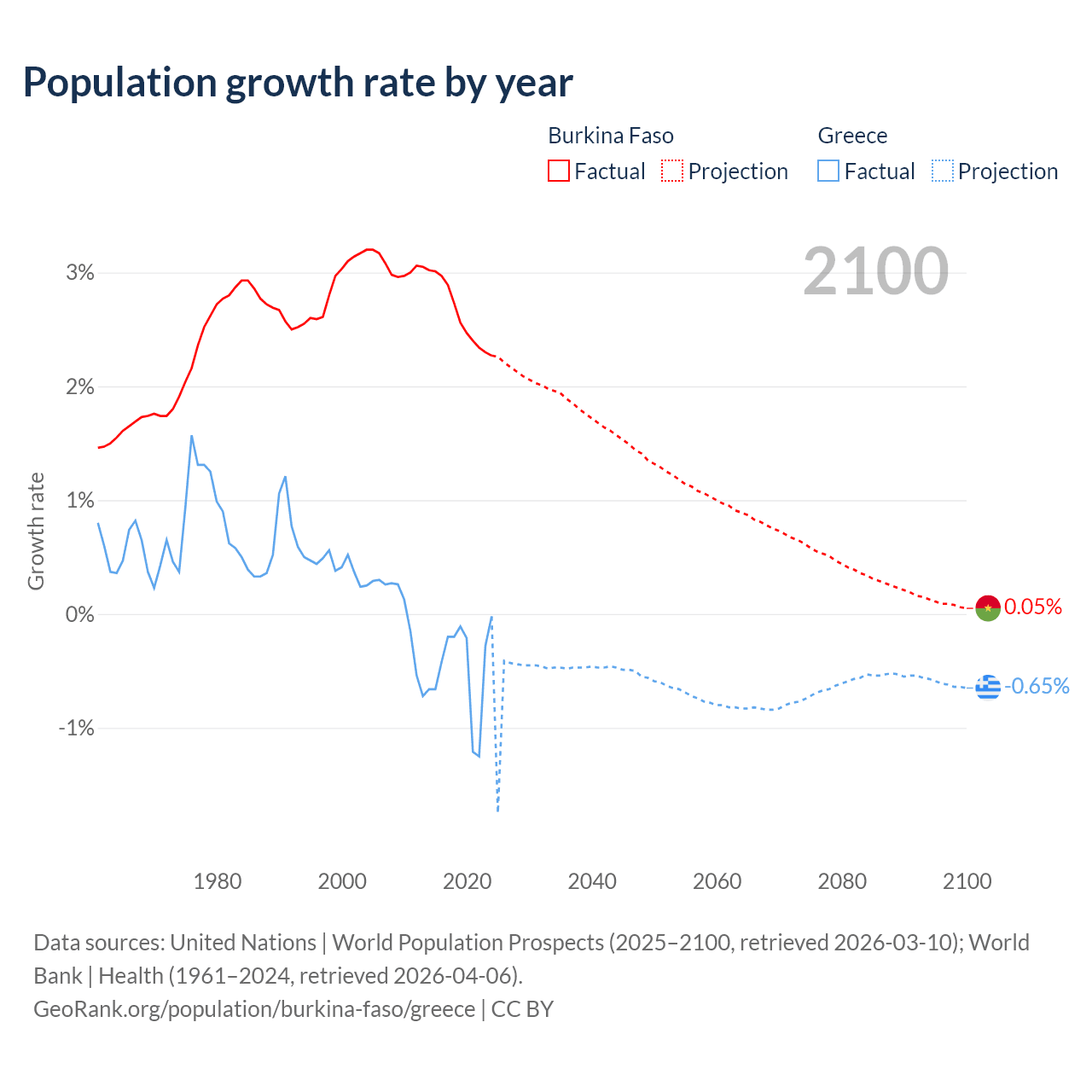 - For the last 10 years, Burkina Faso has had an average growth rate of +2.63% per year vs -0.47% in Greece.