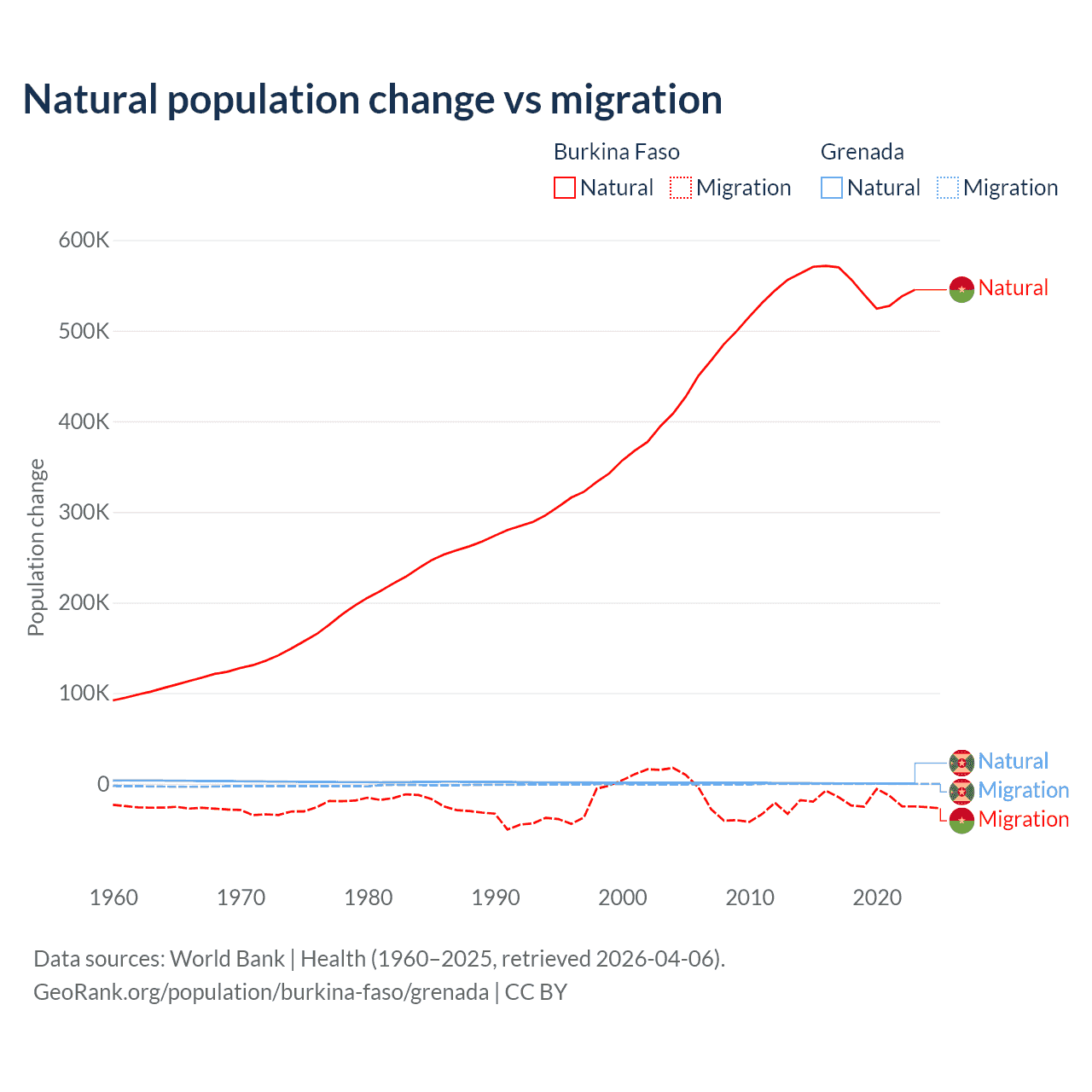 Over the last 10 years, 96.9% of the population change in Burkina Faso is from natural causes (a gain of 5,506,960 people) and 3.13% is from migration (a loss of 177,923 people). In Grenada 76% is from natural causes (a gain of 4,850 people) and 24% is from migration (a loss of 1,535 people).