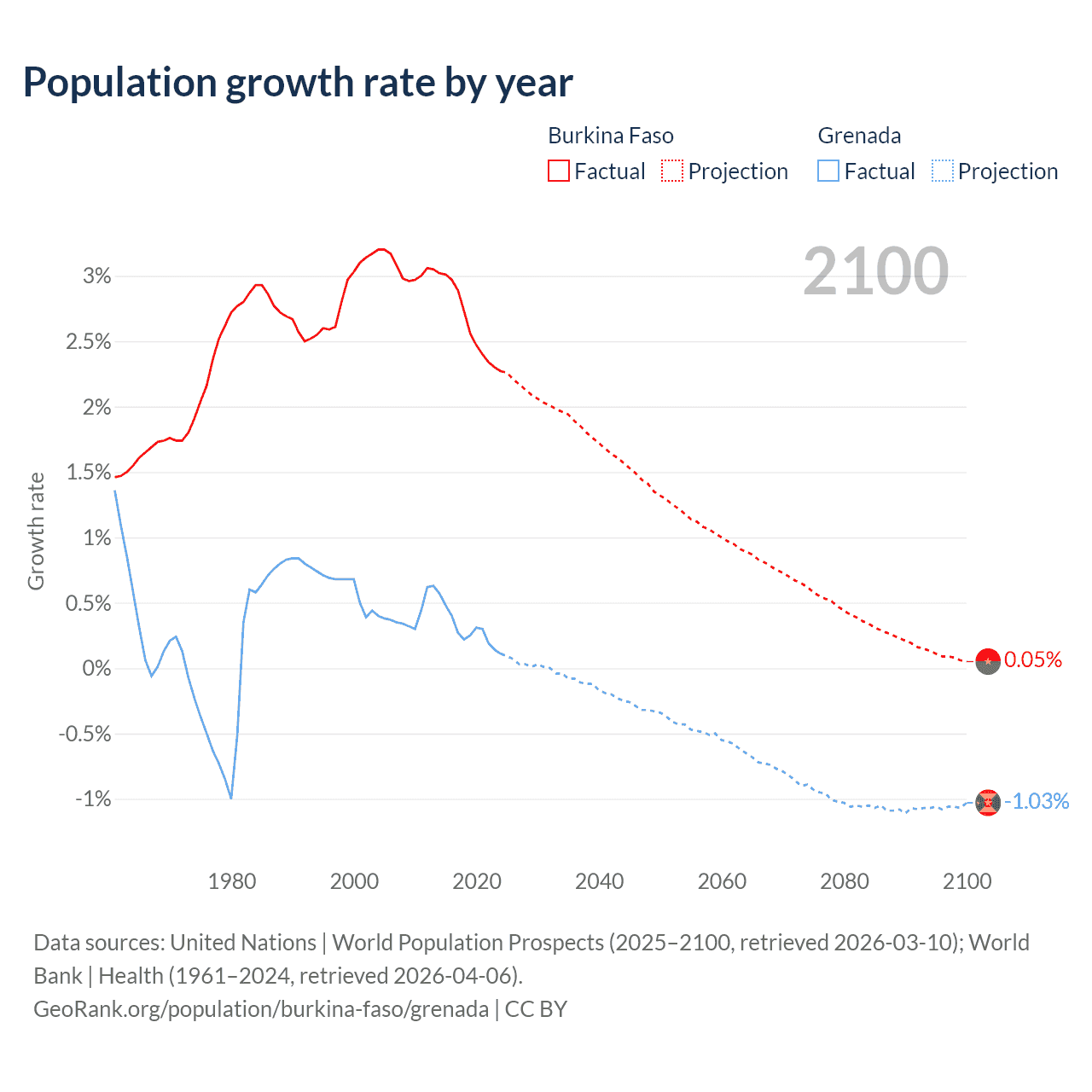 - For the last 10 years, Burkina Faso has had an average growth rate of +2.63% per year vs +0.29% in Grenada.