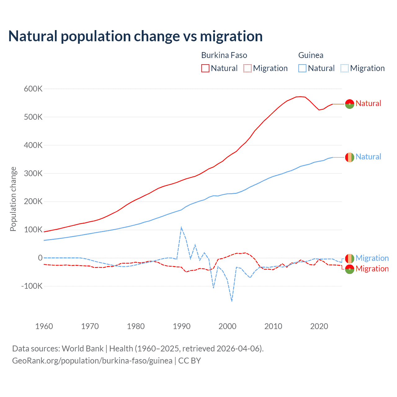 Over the last 10 years, 96.9% of the population change in Burkina Faso is from natural causes (a gain of 5,506,960 people) and 3.13% is from migration (a loss of 177,923 people). In Guinea 97.2% is from natural causes (a gain of 3,346,936 people) and 2.76% is from migration (a loss of 94,924 people).