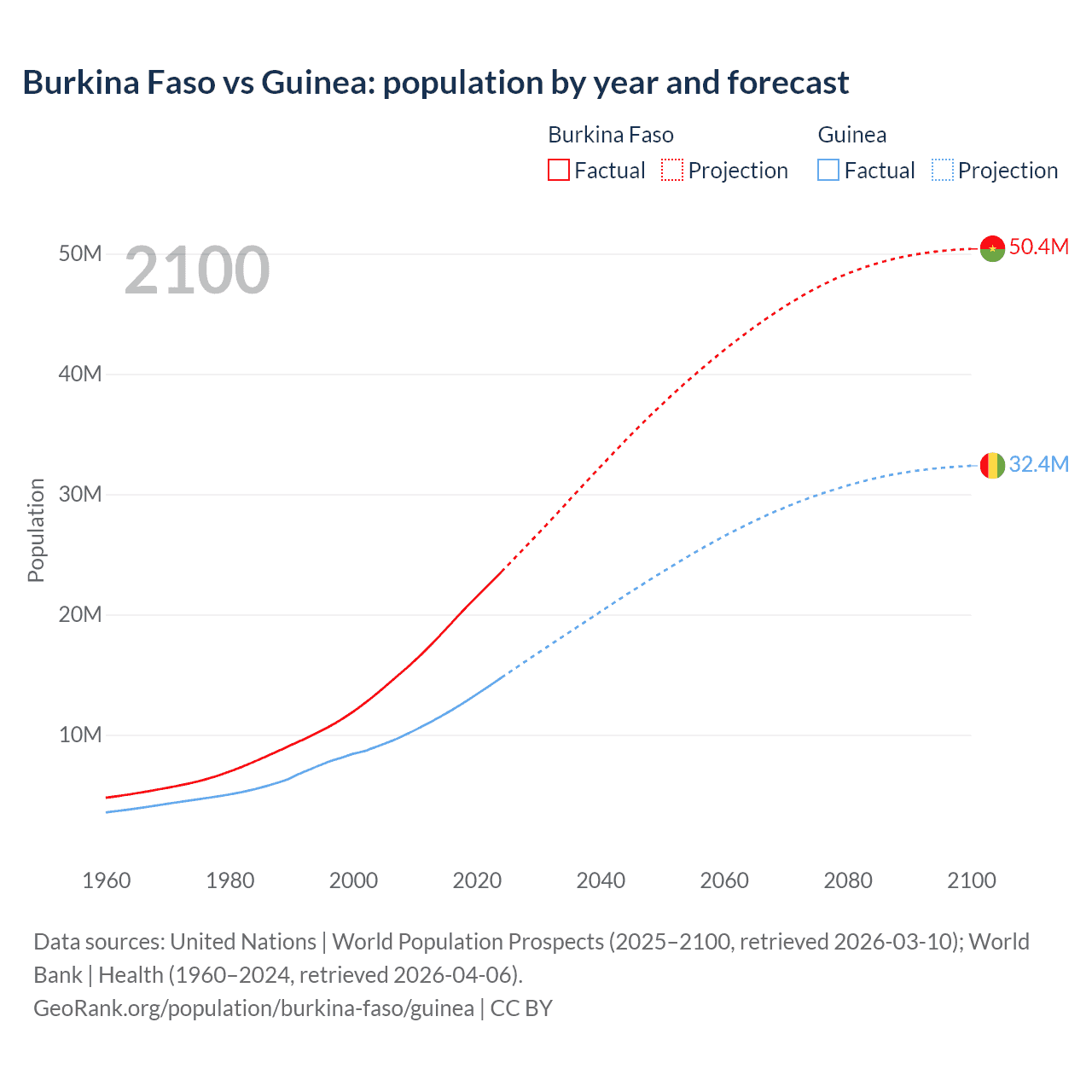 Burkina Faso vs Guinea: population by year and forecast