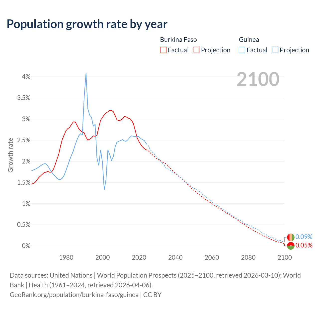 - For the last 10 years, Burkina Faso has had an average growth rate of +2.63% per year vs +2.54% in Guinea.