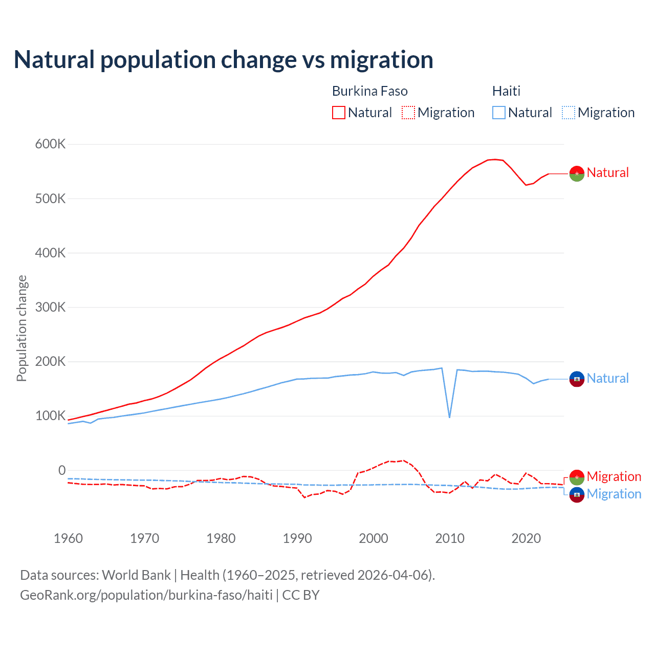 Over the last 10 years, 96.9% of the population change in Burkina Faso is from natural causes (a gain of 5,506,960 people) and 3.13% is from migration (a loss of 177,923 people). In Haiti 83.9% is from natural causes (a gain of 1,740,319 people) and 16.1% is from migration (a loss of 333,076 people).