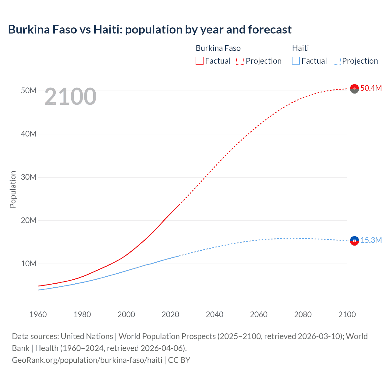 The latest officially reported population of Burkina Faso was 23,548,781 in 2024 vs 11,772,557 people in Haiti in 2024. In 2026, based on the adjusted UN estimation, the current Burkina Faso's population is 24,756,783 people compared to 12,076,663 in Haiti.