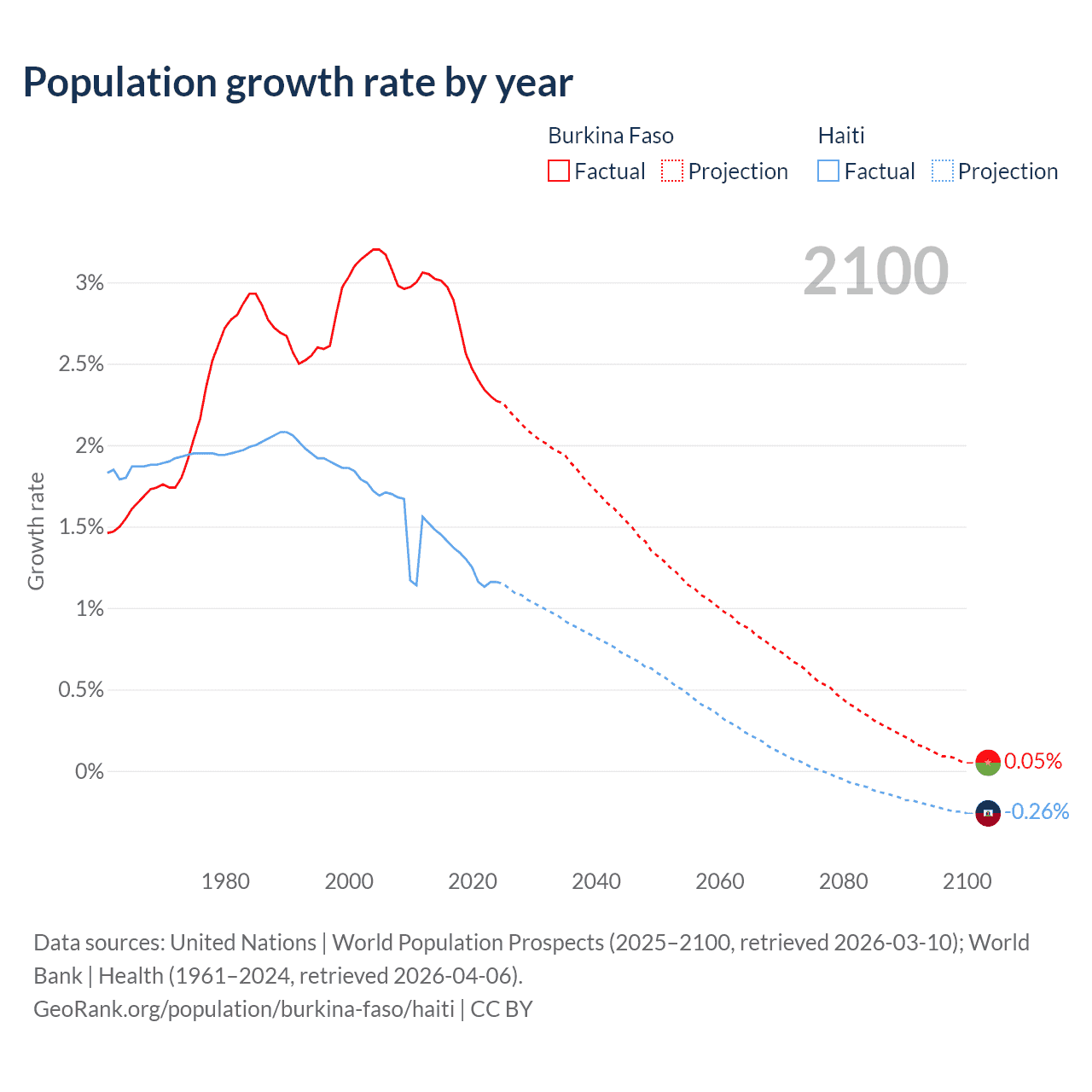 - For the last 10 years, Burkina Faso has had an average growth rate of +2.63% per year vs +1.29% in Haiti.