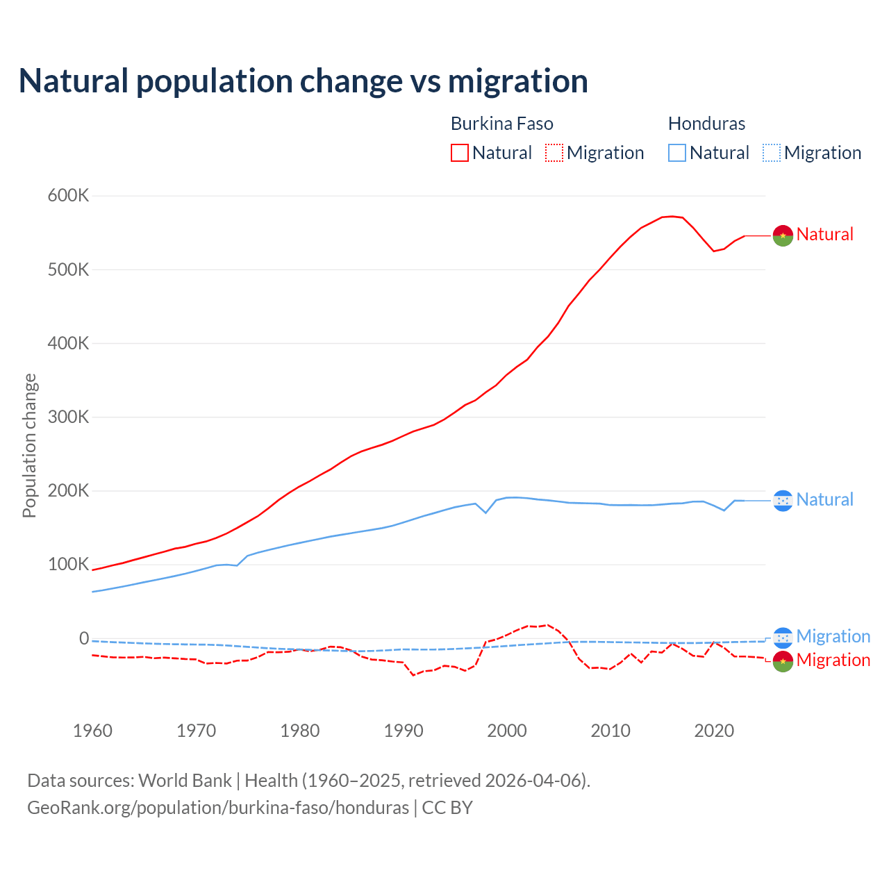 Over the last 10 years, 96.9% of the population change in Burkina Faso is from natural causes (a gain of 5,506,960 people) and 3.13% is from migration (a loss of 177,923 people). In Honduras 96.7% is from natural causes (a gain of 1,821,125 people) and 3.29% is from migration (a loss of 61,965 people).