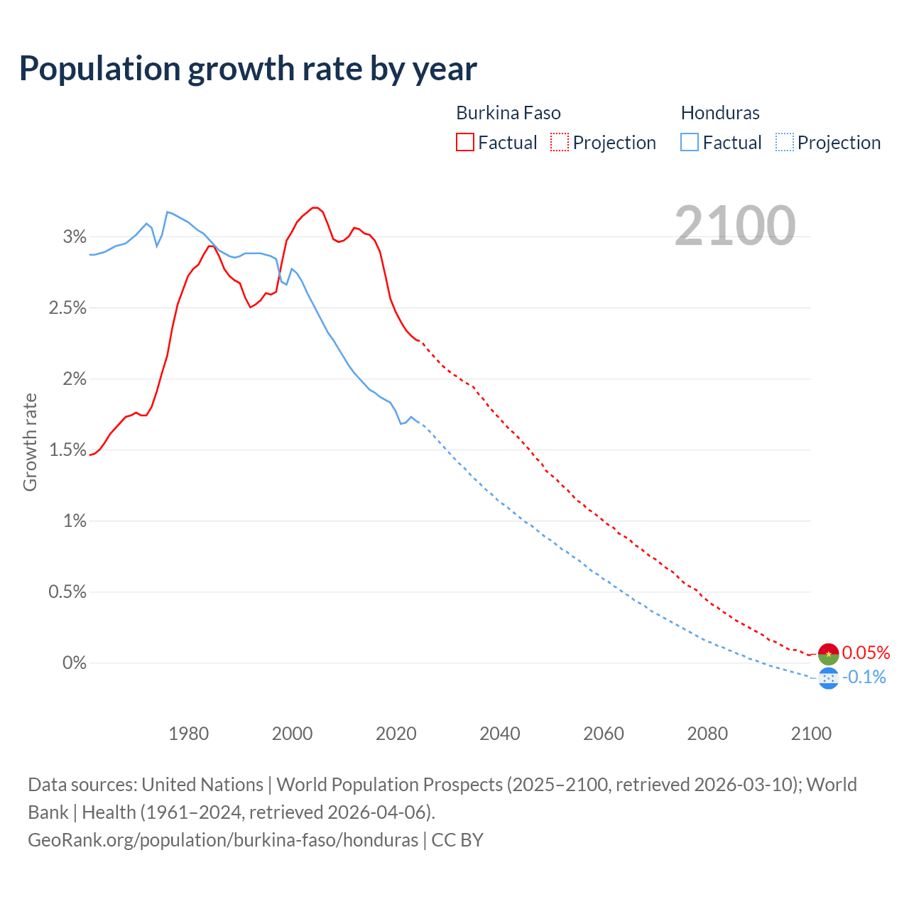 - For the last 10 years, Burkina Faso has had an average growth rate of +2.63% per year vs +1.81% in Honduras.