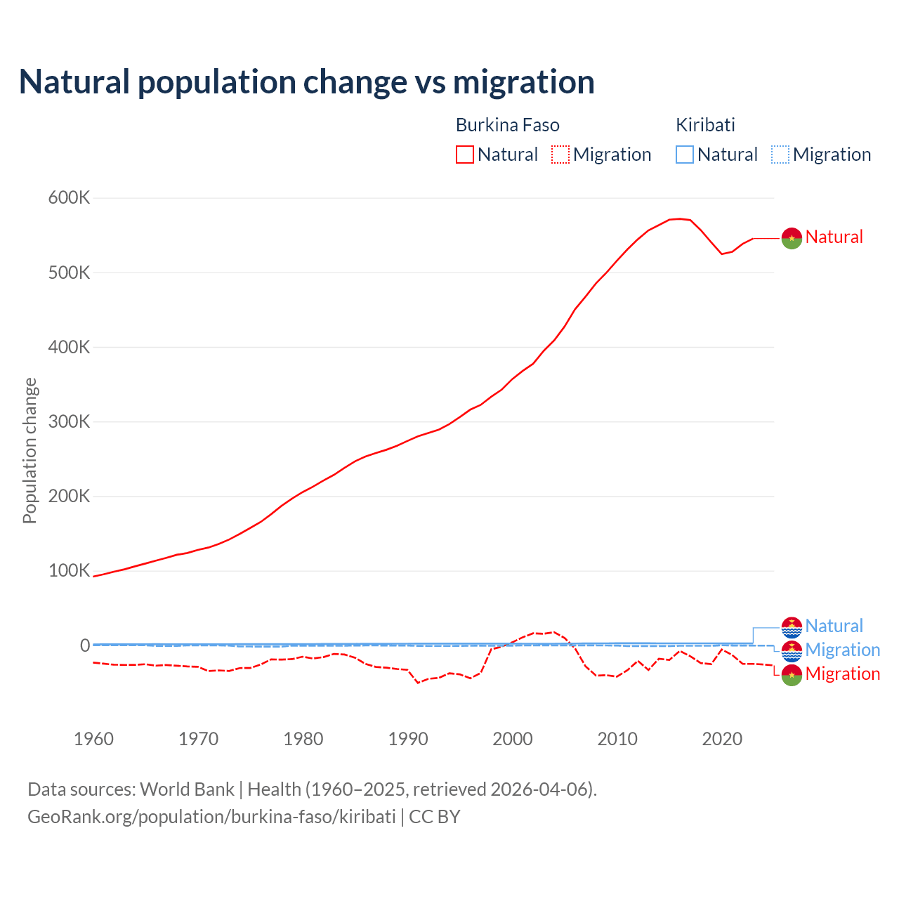 Over the last 10 years, 96.9% of the population change in Burkina Faso is from natural causes (a gain of 5,506,960 people) and 3.13% is from migration (a loss of 177,923 people). In Kiribati 80% is from natural causes (a gain of 25,262 people) and 20% is from migration (a loss of 6,330 people).