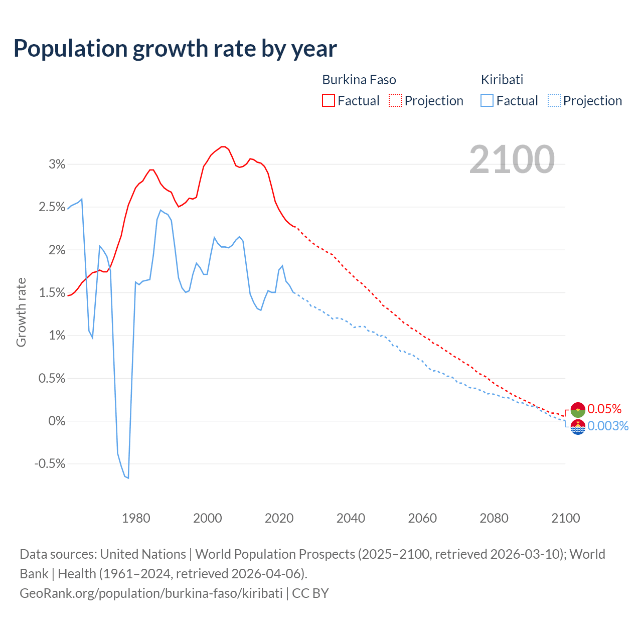 - For the last 10 years, Burkina Faso has had an average growth rate of +2.63% per year vs +1.53% in Kiribati.