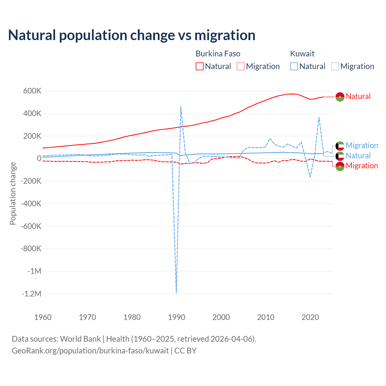 Over the last 10 years, 96.9% of the population change in Burkina Faso is from natural causes (a gain of 5,506,960 people) and 3.13% is from migration (a loss of 177,923 people). In Kuwait 35.8% is from natural causes (a gain of 470,645 people) and 64.2% is from migration (a gain of 845,142 people).