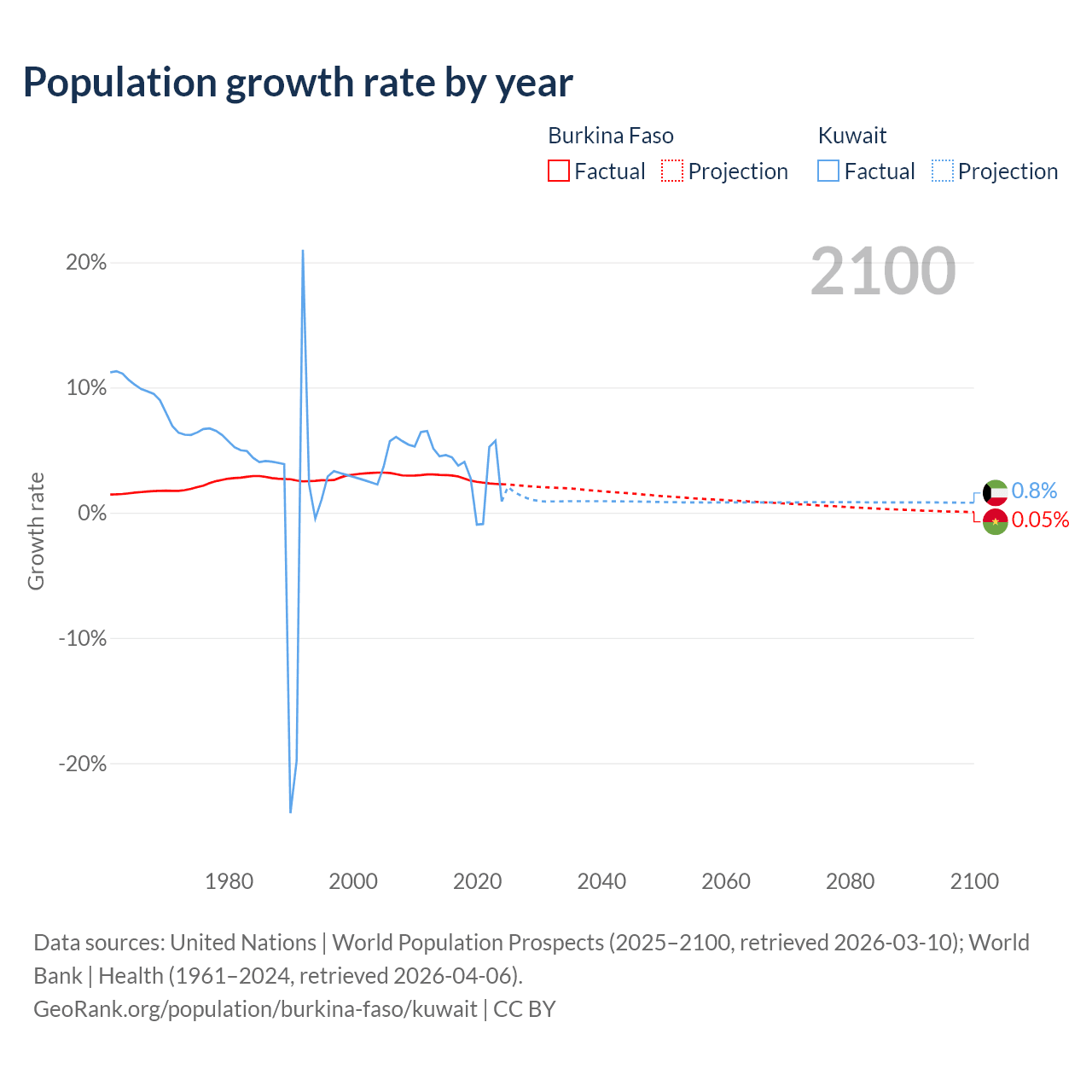 - For the last 10 years, Burkina Faso has had an average growth rate of +2.63% per year vs +3.1% in Kuwait.