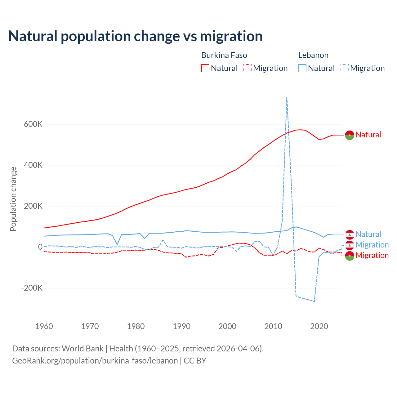 Over the last 10 years, 96.9% of the population change in Burkina Faso is from natural causes (a gain of 5,506,960 people) and 3.13% is from migration (a loss of 177,923 people). In Lebanon 40.1% is from natural causes (a gain of 739,256 people) and 59.9% is from migration (a loss of 1,103,772 people).