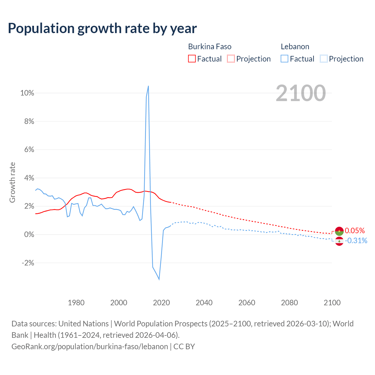 - For the last 10 years, Burkina Faso has had an average growth rate of +2.63% per year vs +0.16% in Lebanon.