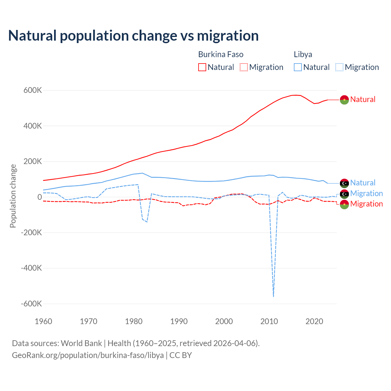 Over the last 10 years, 96.9% of the population change in Burkina Faso is from natural causes (a gain of 5,506,960 people) and 3.13% is from migration (a loss of 177,923 people). In Libya 99.4% is from natural causes (a gain of 975,799 people) and 0.63% is from migration (a loss of 6,150 people).