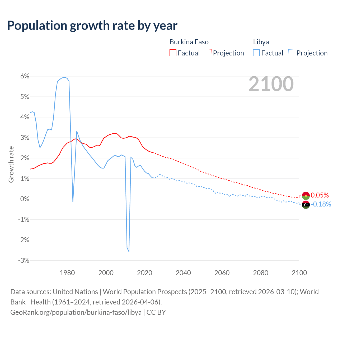 - For the last 10 years, Burkina Faso has had an average growth rate of +2.63% per year vs +1.44% in Libya.