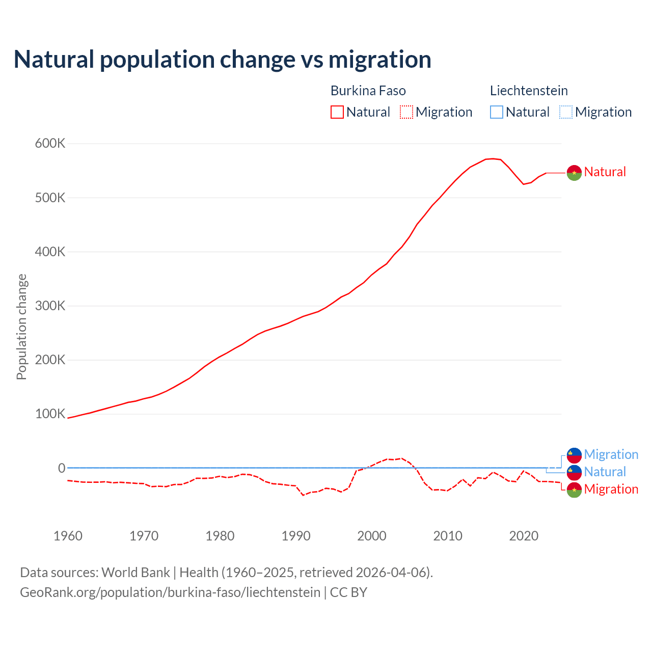 Over the last 10 years, 96.9% of the population change in Burkina Faso is from natural causes (a gain of 5,506,960 people) and 3.13% is from migration (a loss of 177,923 people). In Liechtenstein 32.4% is from natural causes (a gain of 883 people) and 67.6% is from migration (a gain of 1,843 people).