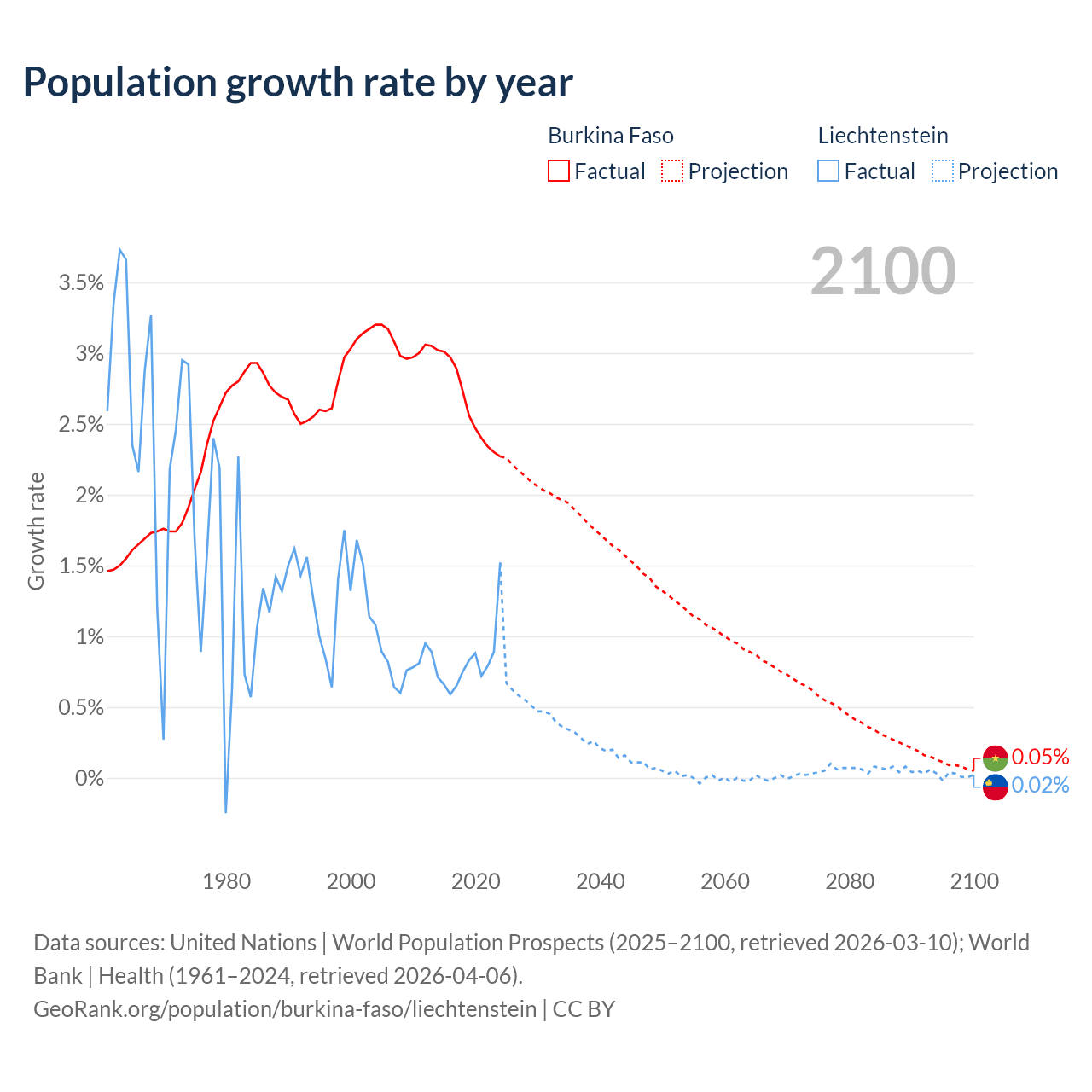 - For the last 10 years, Burkina Faso has had an average growth rate of +2.63% per year vs +0.82% in Liechtenstein.