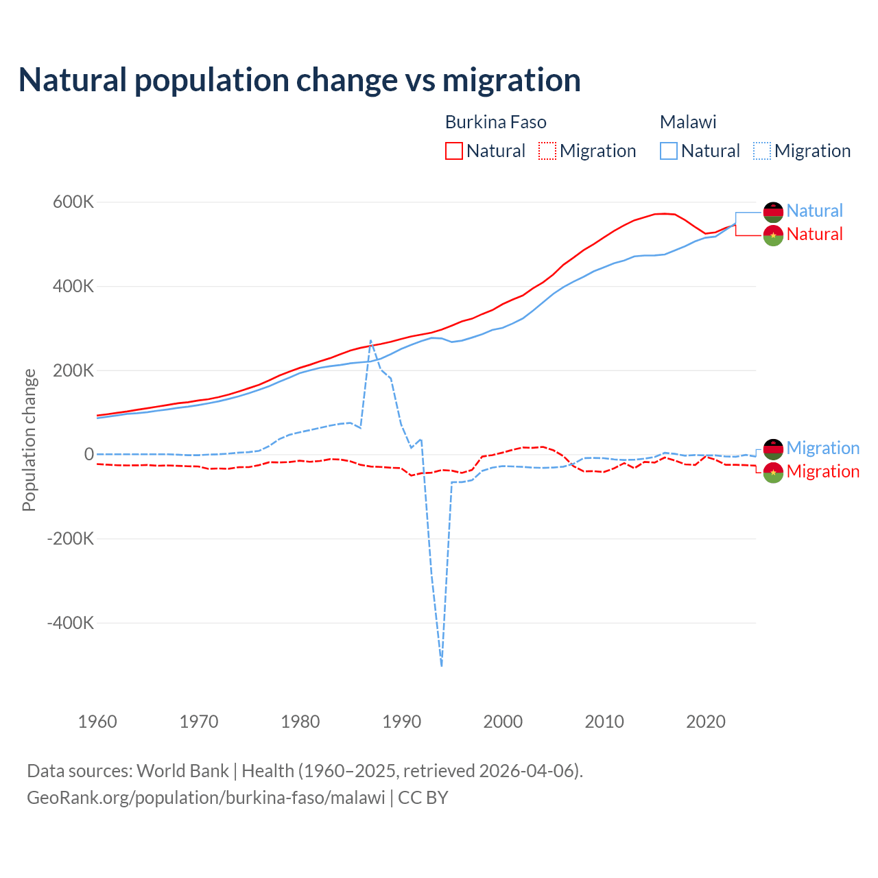 Over the last 10 years, 96.9% of the population change in Burkina Faso is from natural causes (a gain of 5,506,960 people) and 3.13% is from migration (a loss of 177,923 people). In Malawi 99.3% is from natural causes (a gain of 5,019,393 people) and 0.67% is from migration (a loss of 33,768 people).
