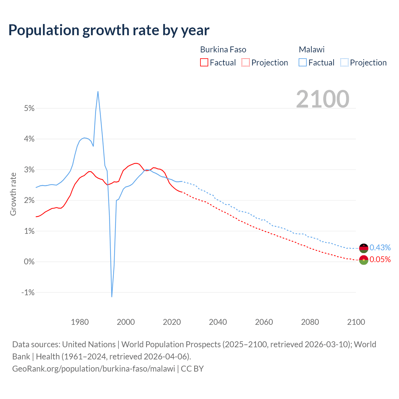 - For the last 10 years, Burkina Faso has had an average growth rate of +2.63% per year vs +2.7% in Malawi.