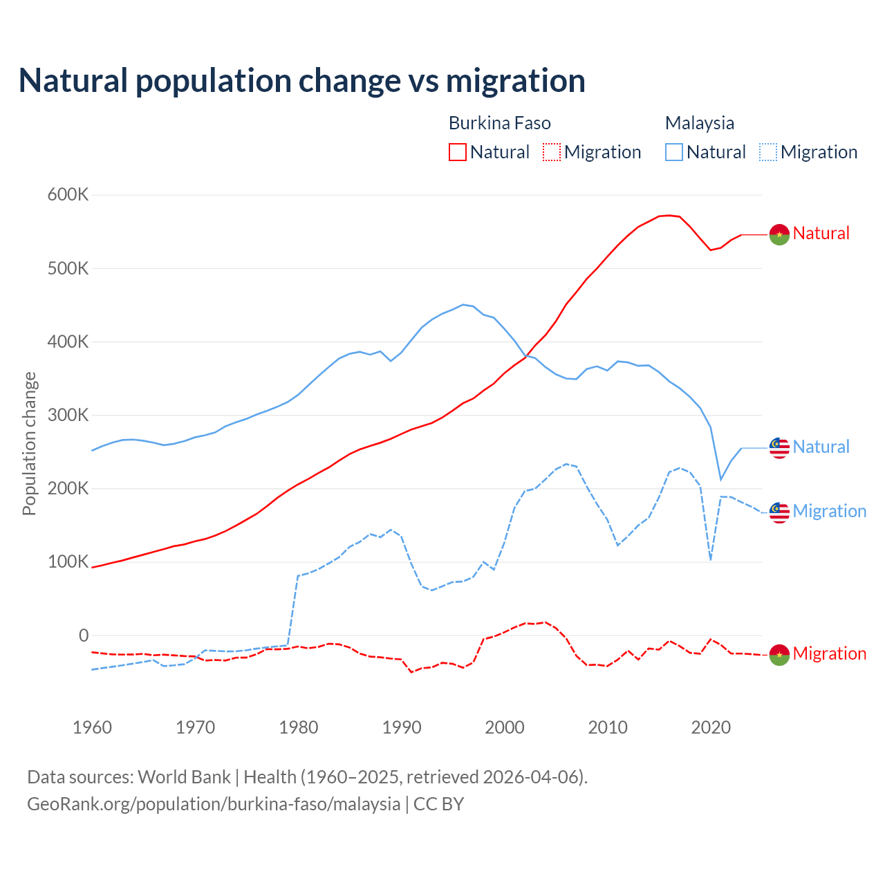 Over the last 10 years, 96.9% of the population change in Burkina Faso is from natural causes (a gain of 5,506,960 people) and 3.13% is from migration (a loss of 177,923 people). In Malaysia 61.7% is from natural causes (a gain of 3,029,648 people) and 38.3% is from migration (a gain of 1,882,159 people).