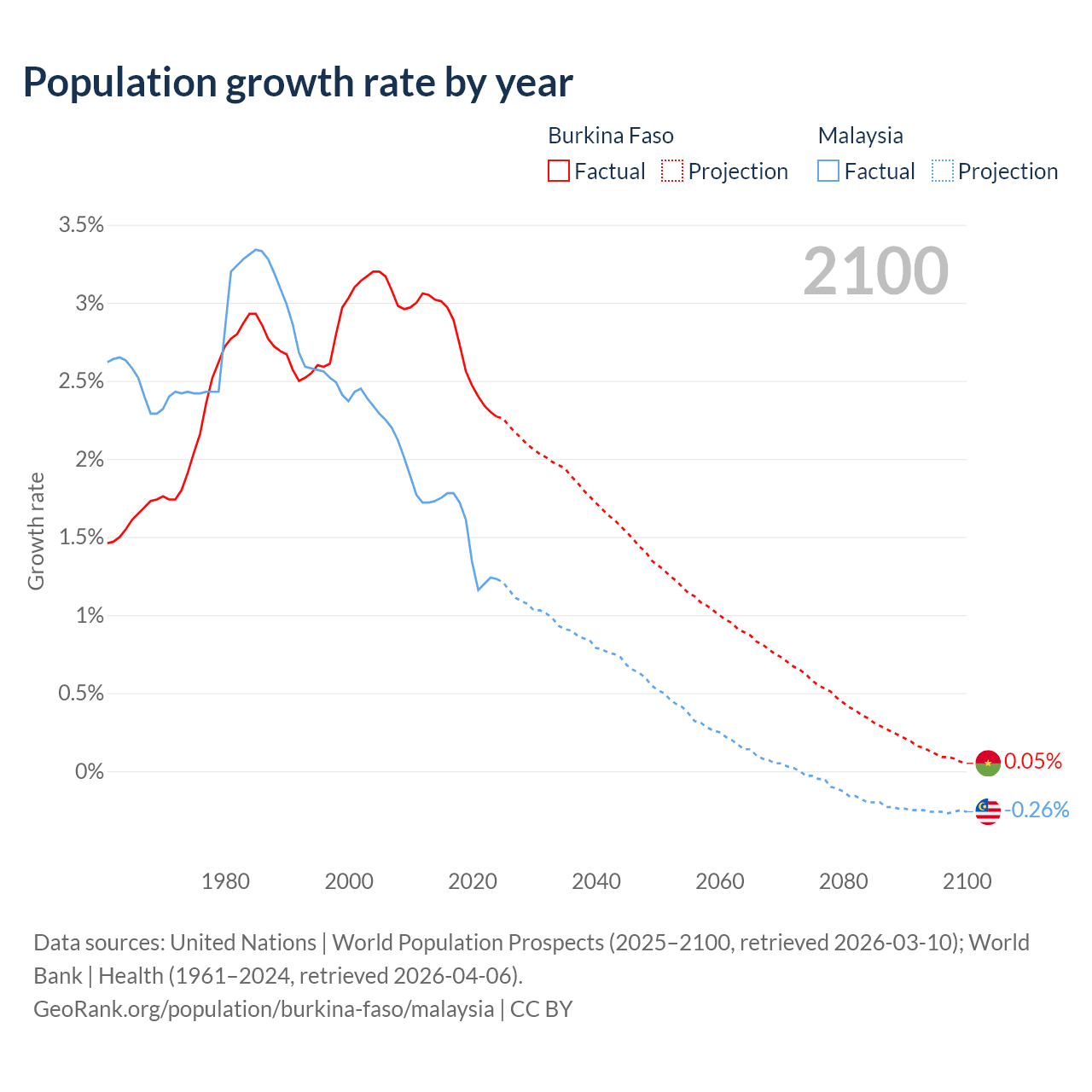 - For the last 10 years, Burkina Faso has had an average growth rate of +2.63% per year vs +1.5% in Malaysia.