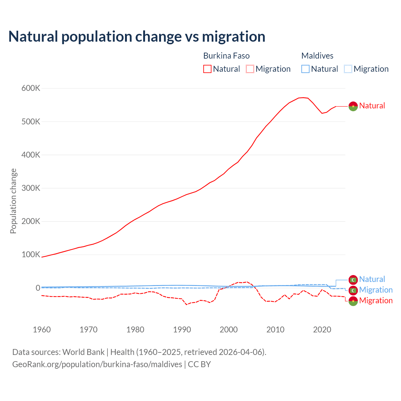 Over the last 10 years, 96.9% of the population change in Burkina Faso is from natural causes (a gain of 5,506,960 people) and 3.13% is from migration (a loss of 177,923 people). In Maldives 42.7% is from natural causes (a gain of 51,342 people) and 57.3% is from migration (a gain of 68,788 people).
