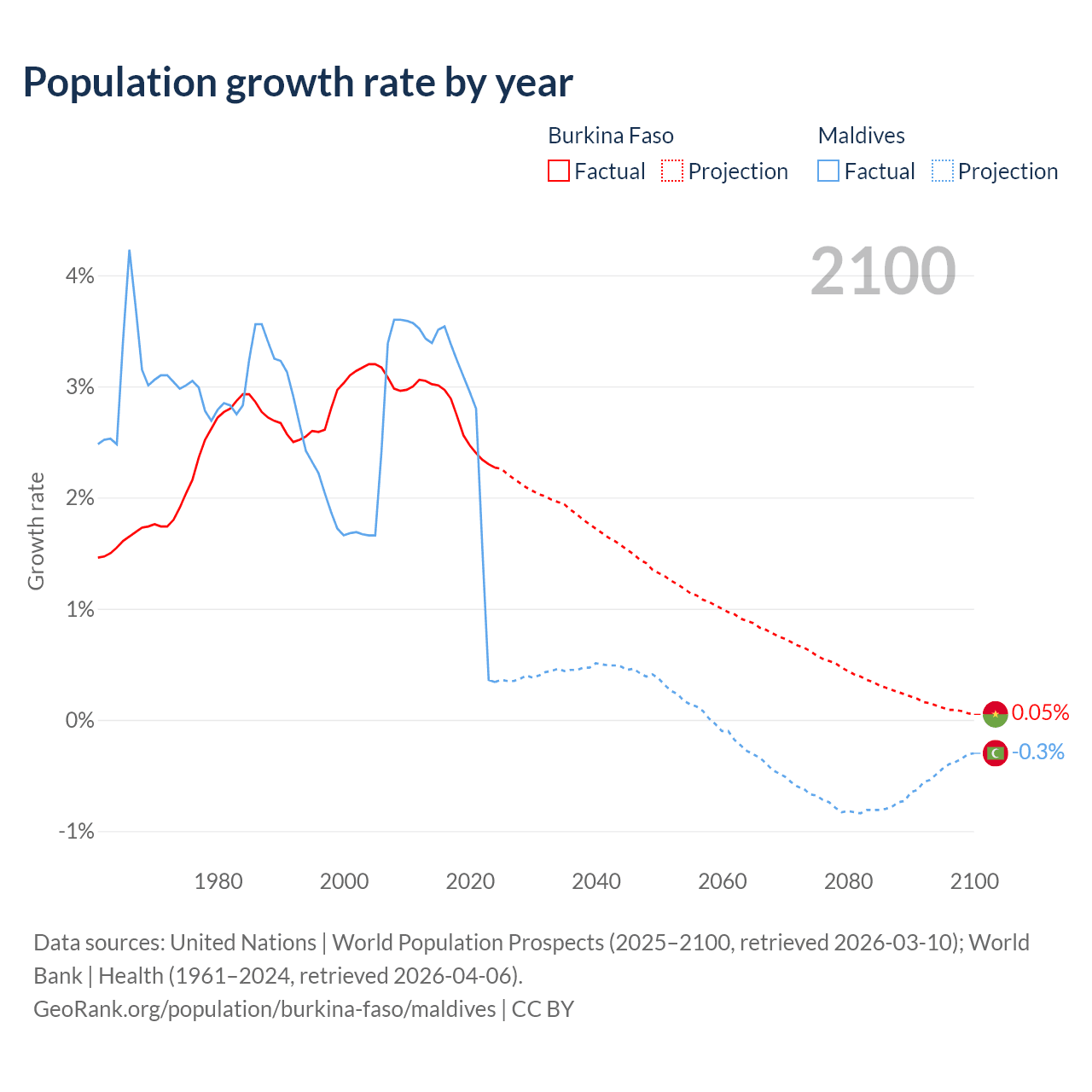 - For the last 10 years, Burkina Faso has had an average growth rate of +2.63% per year vs +2.56% in Maldives.