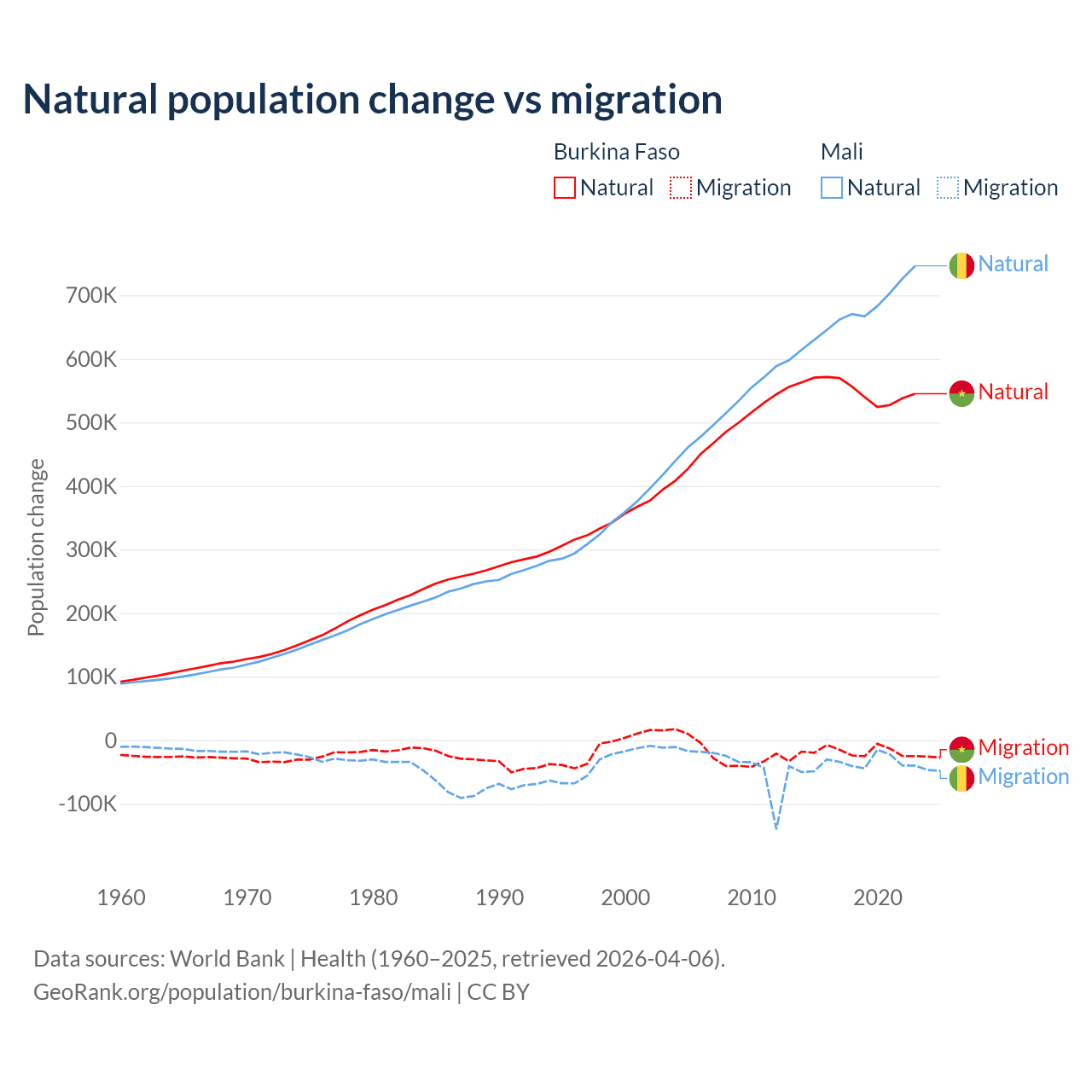 Over the last 10 years, 96.9% of the population change in Burkina Faso is from natural causes (a gain of 5,506,960 people) and 3.13% is from migration (a loss of 177,923 people). In Mali 94.9% is from natural causes (a gain of 6,749,473 people) and 5.13% is from migration (a loss of 365,292 people).